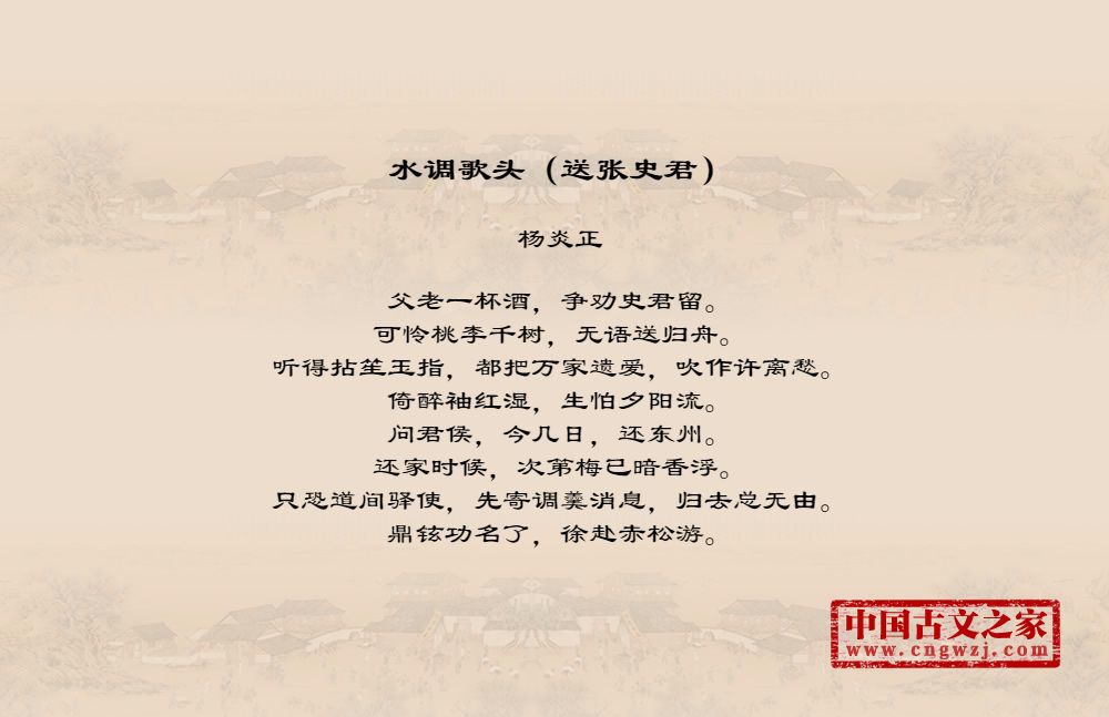 父老一杯酒,争劝史君留。可怜桃李千树,无语送归舟。听得拈笙玉指,都把万家遗爱,吹作许离愁。倚醉袖红湿,生怕夕阳流。问君侯,今几日,还东州。还家时候,次第梅已暗香浮。只恐道间驿使,先寄调羹消息,归去总无由。鼎铉功名了,徐赴赤松游。