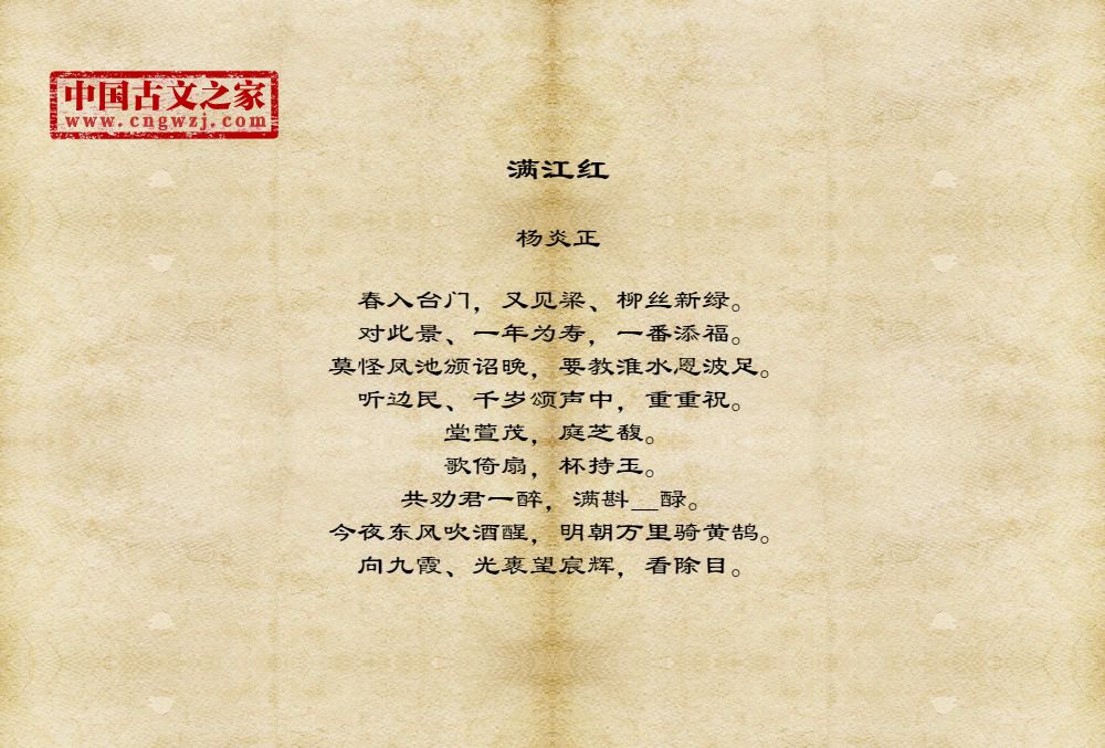 春入台门,又见梁、柳丝新绿。对此景、一年为寿,一番添福。莫怪凤池颁诏晚,要教淮水恩波足。听边民、千岁颂声中,重重祝。堂萱茂,庭芝馥。歌倚扇,杯持玉。共劝君一醉,满斟_醁。今夜东风吹酒醒,明朝万里骑黄鹄。向九霞、光裹望宸辉,看除目。
