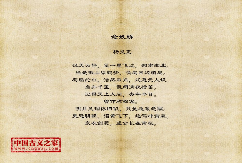 汉天云静,望一星飞过,湘南湘北。当是郴山猿鹤梦,唤起日边消息。羽扇纶巾,浩然乘兴,此意无人识。扁舟千里,但闻清夜横笛。记得天上人间,去年今日。曾作称觞客。明月风烟依旧似,只觉蓬莱悬隔。更恐明朝,诏黄飞下,趣驾冲霄翼。衮衣剑履,望公长在南极。