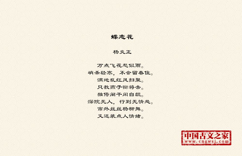 万点飞花愁似雨。峭杀轻寒,不会留春住。满地乱红风扫聚。只教燕子衔将去。独倚阑干闲自觑。深院无人,行到无情处。帘外丝丝杨柳舞。又还装点人情绪。