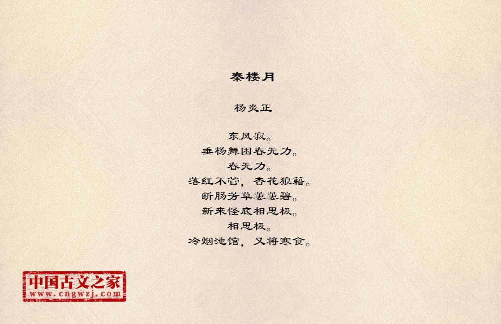 东风寂。垂杨舞困春无力。春无力。落红不管,杏花狼籍。断肠芳草萋萋碧。新来怪底相思极。相思极。冷烟池馆,又将寒食。