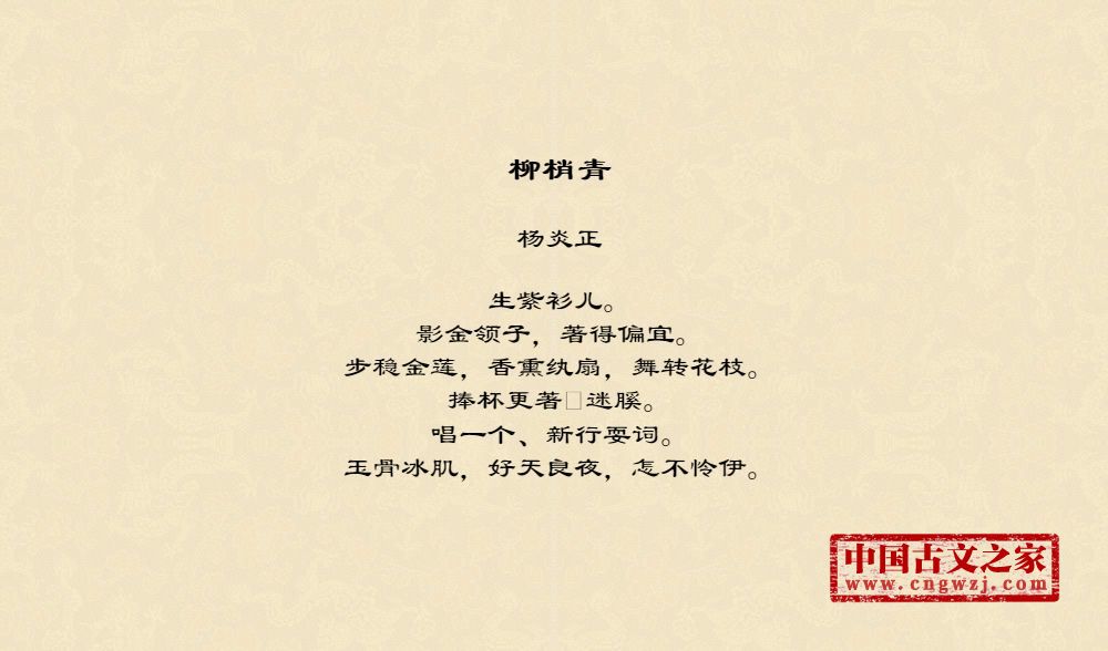 生紫衫儿。影金领子,著得偏宜。步稳金莲,香熏纨扇,舞转花枝。捧杯更著迷膎。唱一个、新行耍词。玉骨冰肌,好天良夜,怎不怜伊。