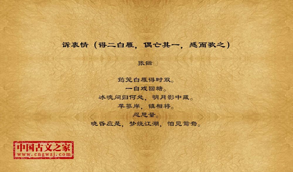 《诉衷情(得二白雁,偶亡其一,感而歌之)》由张鎡创作