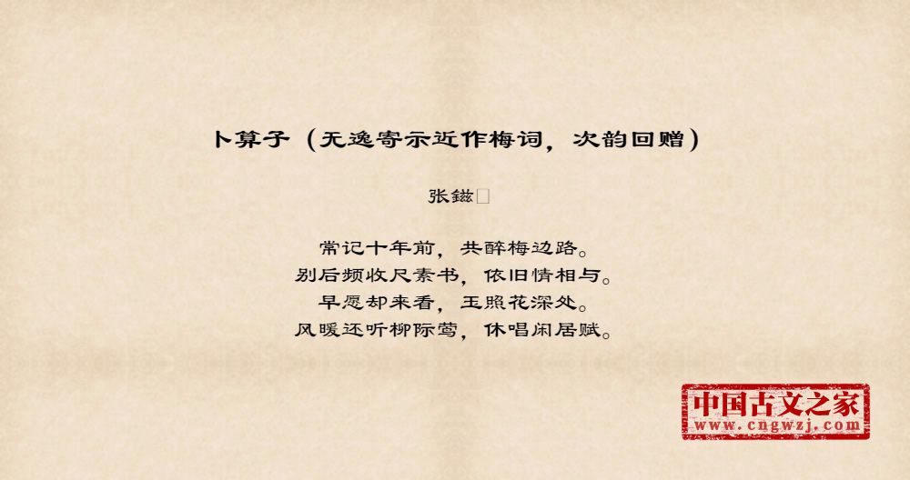 《卜算子(无逸寄示近作梅词,次韵回赠)》的原文打印版(张鎡)