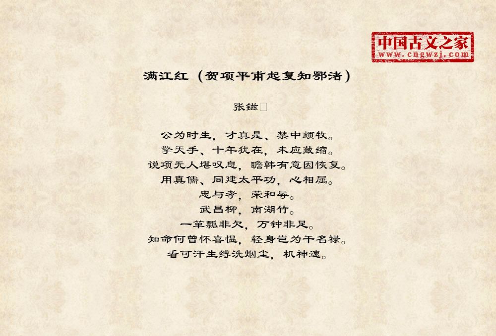 《满江红(贺项平甫起复知鄂渚)》的原文打印版(张鎡)