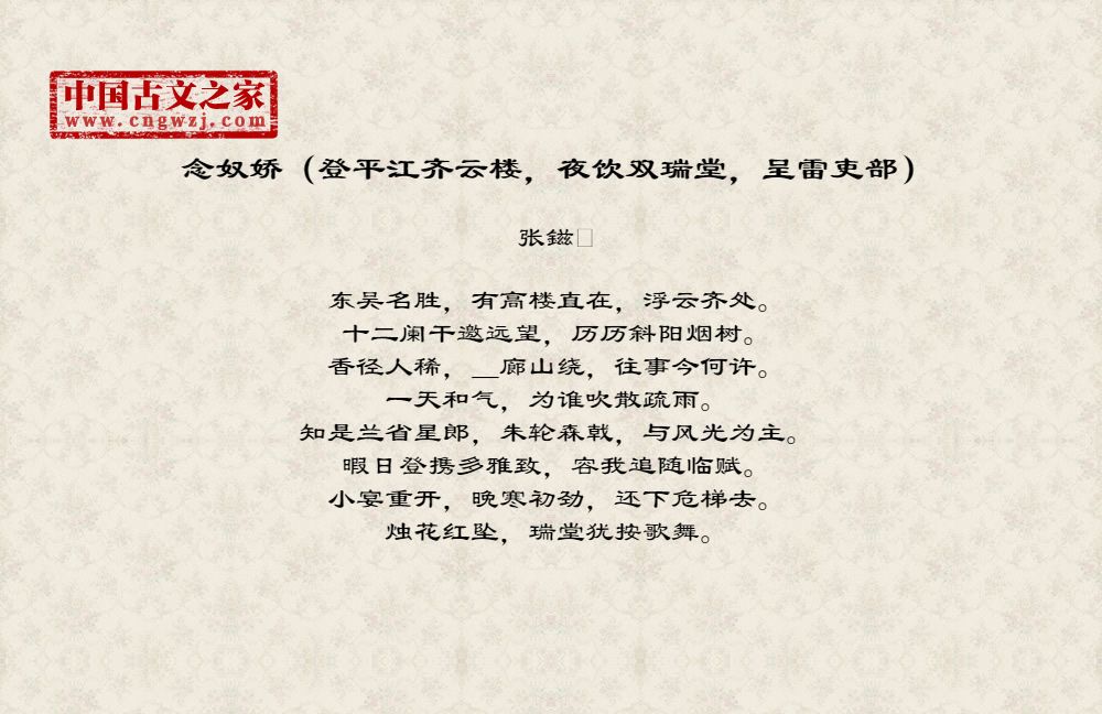 《念奴娇(登平江齐云楼,夜饮双瑞堂,呈雷吏部)》由张鎡创作