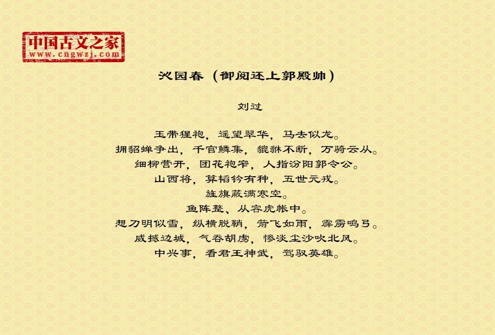 玉带猩袍,遥望翠华,马去似龙。拥貂蝉争出,千官鳞集,貔貅不断,万骑云从。细柳营开,团花袍窄,人指汾阳郭令公。山西将,算韬钤有种,五世元戎。旌旗蔽满寒空。鱼阵整、从容虎帐中。想刀明似雪,纵横脱鞘,箭飞如雨,霹雳鸣弓。威撼边城,气吞胡虏,惨淡尘沙吹北风。中兴事,看君王神武,驾驭英雄。