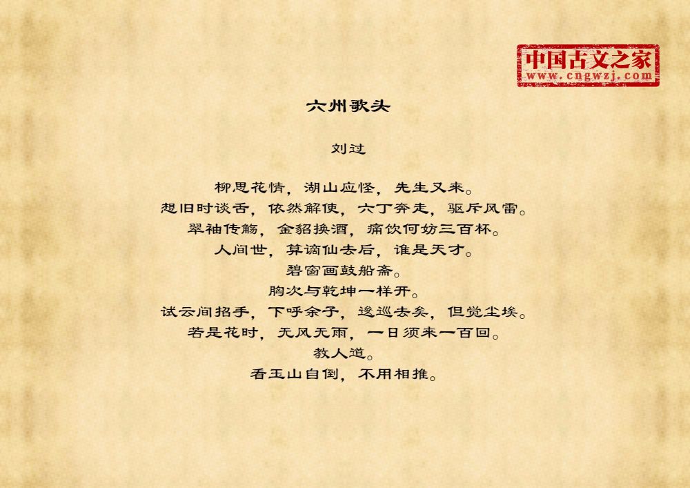 刘过(1154~1206)南宋文学家,字改之,号龙洲道人。吉州太和(今江西泰和县)人,长于庐陵(今江西吉安),去世于江苏昆山,今其墓尚在。四次应举不中