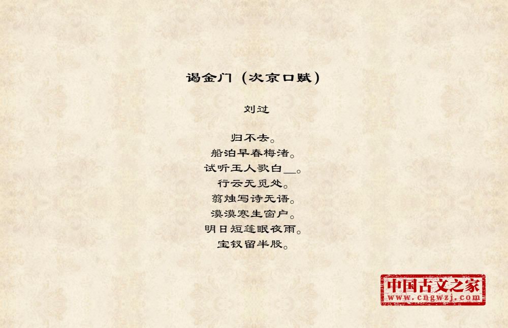 刘过(1154~1206)南宋文学家,字改之,号龙洲道人。吉州太和(今江西泰和县)人,长于庐陵(今江西吉安),去世于江苏昆山,今其墓尚在。四次应举不中