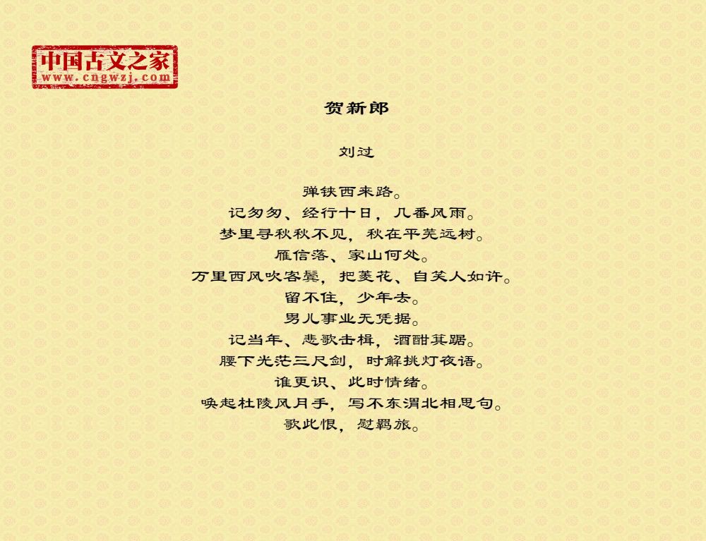 刘过(1154~1206)南宋文学家,字改之,号龙洲道人。吉州太和(今江西泰和县)人,长于庐陵(今江西吉安),去世于江苏昆山,今其墓尚在。四次应举不中