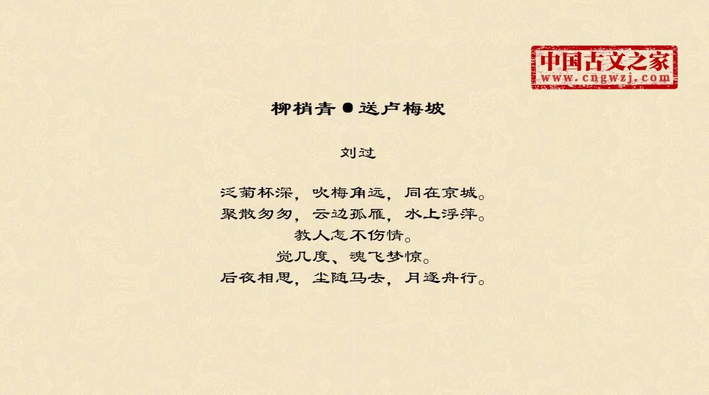 泛菊杯深,吹梅角远,同在京城。聚散匆匆,云边孤雁,水上浮萍。教人怎不伤情。觉几度、魂飞梦惊。后夜相思,尘随马去,月逐舟行。