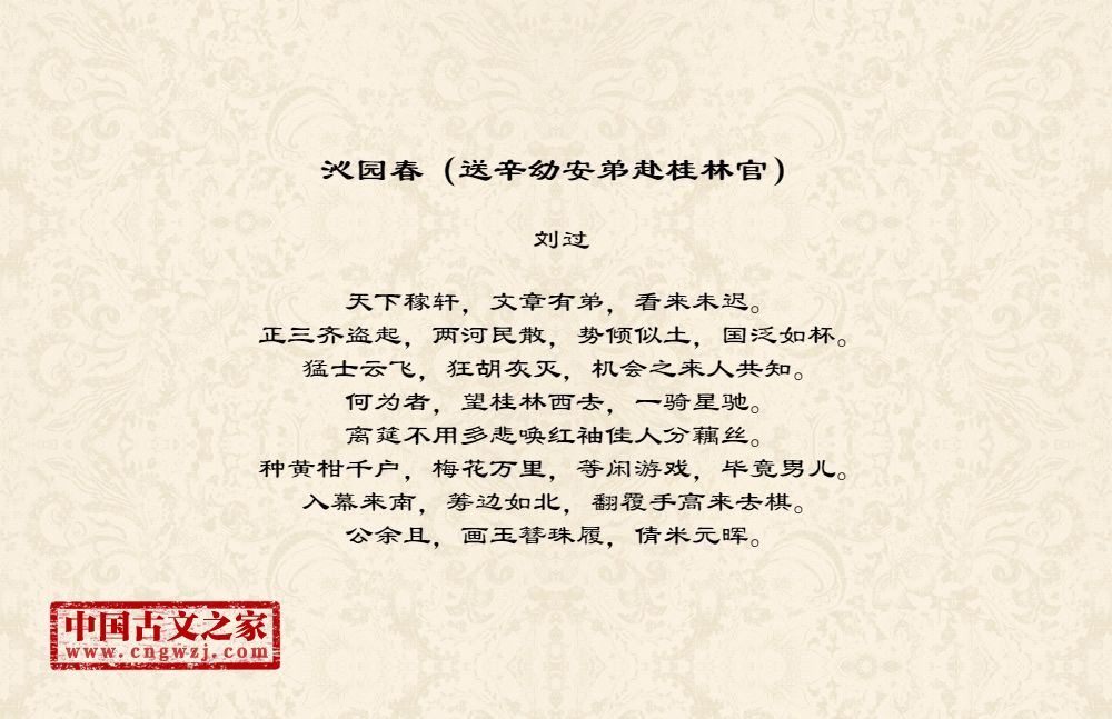 《沁园春(送辛幼安弟赴桂林官)》由刘过创作