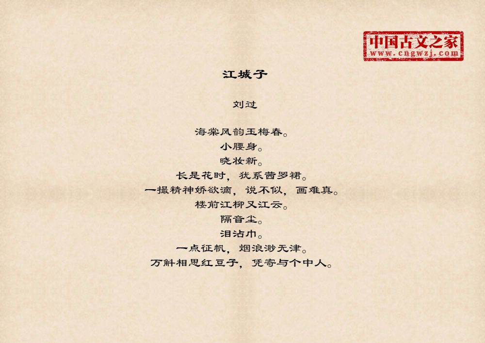 海棠风韵玉梅春。小腰身。晓妆新。长是花时,犹系茜罗裙。一撮精神娇欲滴,说不似,画难真。楼前江柳又江云。隔音尘。泪沾巾。一点征帆,烟浪渺无津。万斛相思红豆子,凭寄与个中人。