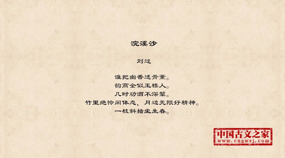 谁把幽香透骨薰。韵高全似玉楼人。几时劝酒不深颦。竹里绝怜闲体态,月边无限好精神。一枝斜插坐生春。