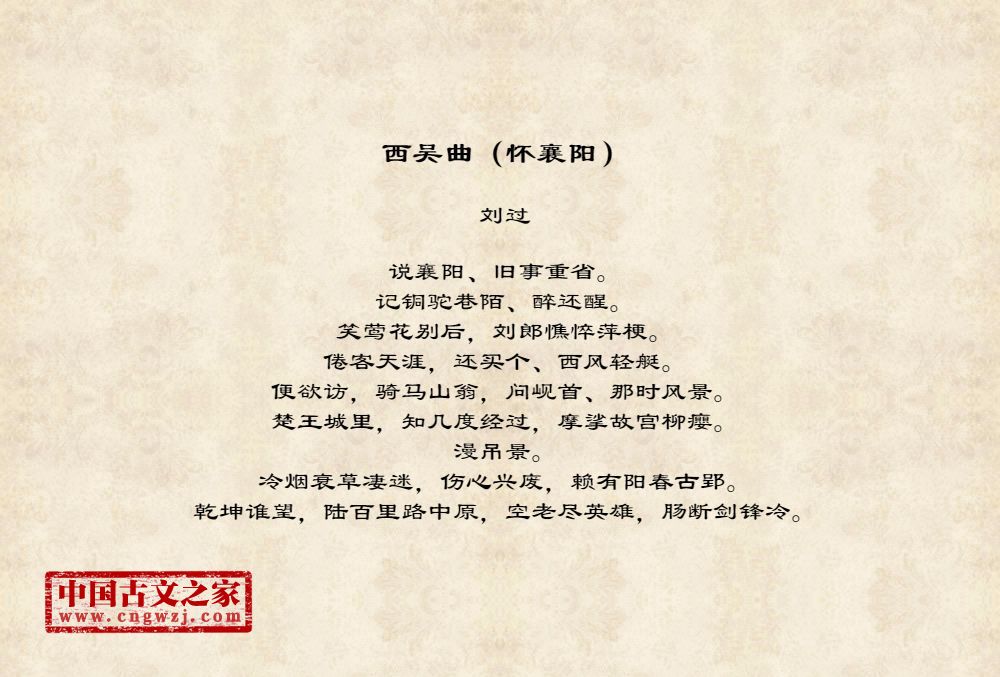 刘过(1154~1206)南宋文学家,字改之,号龙洲道人。吉州太和(今江西泰和县)人,长于庐陵(今江西吉安),去世于江苏昆山,今其墓尚在。四次应举不中