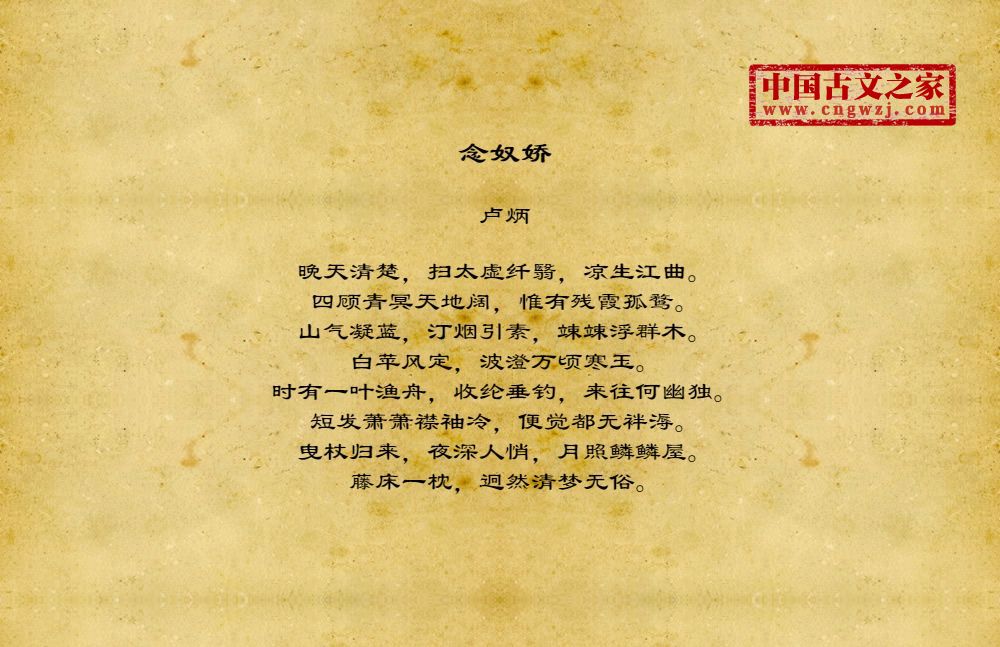晚天清楚,扫太虚纤翳,凉生江曲。四顾青冥天地阔,惟有残霞孤鹜。山气凝蓝,汀烟引素,竦竦浮群木。白苹风定,波澄万顷寒玉。时有一叶渔舟,收纶垂钓,来往何幽独。短发萧萧襟袖冷,便觉都无袢溽。曳杖归来,夜深人悄,月照鳞鳞屋。藤床一枕,迥然清梦无俗。