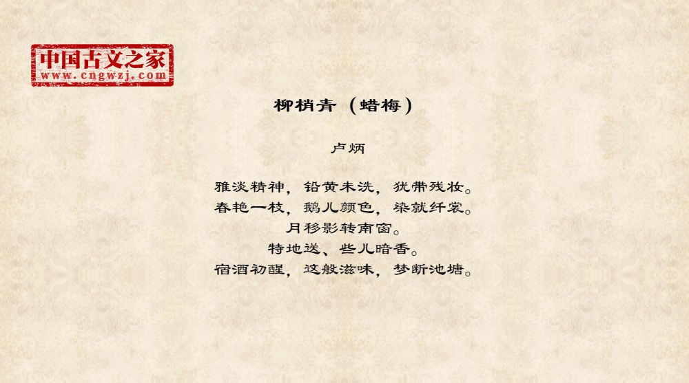 雅淡精神,铅黄未洗,犹带残妆。春艳一枝,鹅儿颜色,染就纤裳。月移影转南窗。特地送、些儿暗香。宿酒初醒,这般滋味,梦断池塘。
