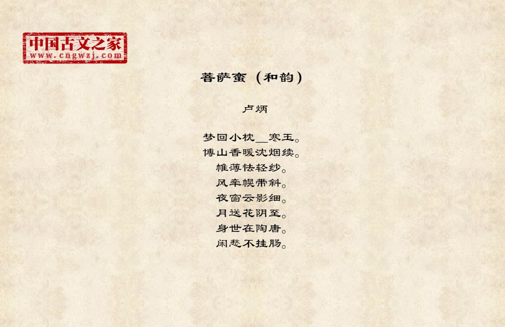 梦回小枕_寒玉。博山香暖沈烟续。帷薄怯轻纱。风牵幌带斜。夜窗云影细。月送花阴至。身世在陶唐。闲愁不挂肠。