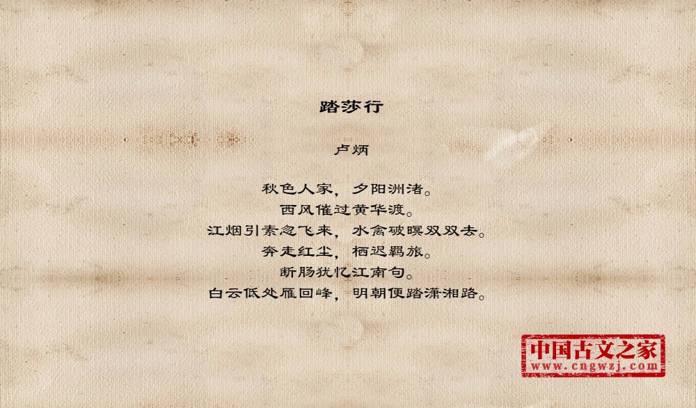 秋色人家,夕阳洲渚。西风催过黄华渡。江烟引素忽飞来,水禽破暝双双去。奔走红尘,栖迟羁旅。断肠犹忆江南句。白云低处雁回峰,明朝便踏潇湘路。