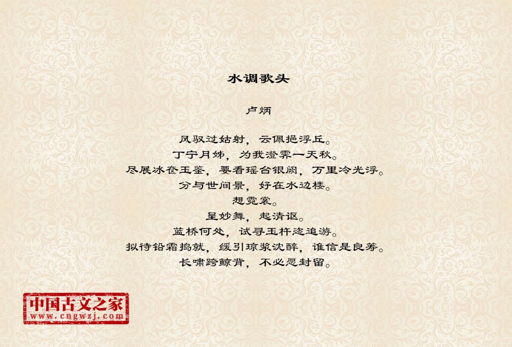 风驭过姑射,云佩挹浮丘。丁宁月姊,为我澄霁一天秋。尽展冰奁玉鉴,要看瑶台银阙,万里冷光浮。分与世间景,好在水边楼。想霓裳。呈妙舞,起清讴。蓝桥何处,试寻玉杵恣追游。拟待铅霜捣就,缓引琼浆沈醉,谁信是良筹。长啸跨鲸背,不必愿封留。
