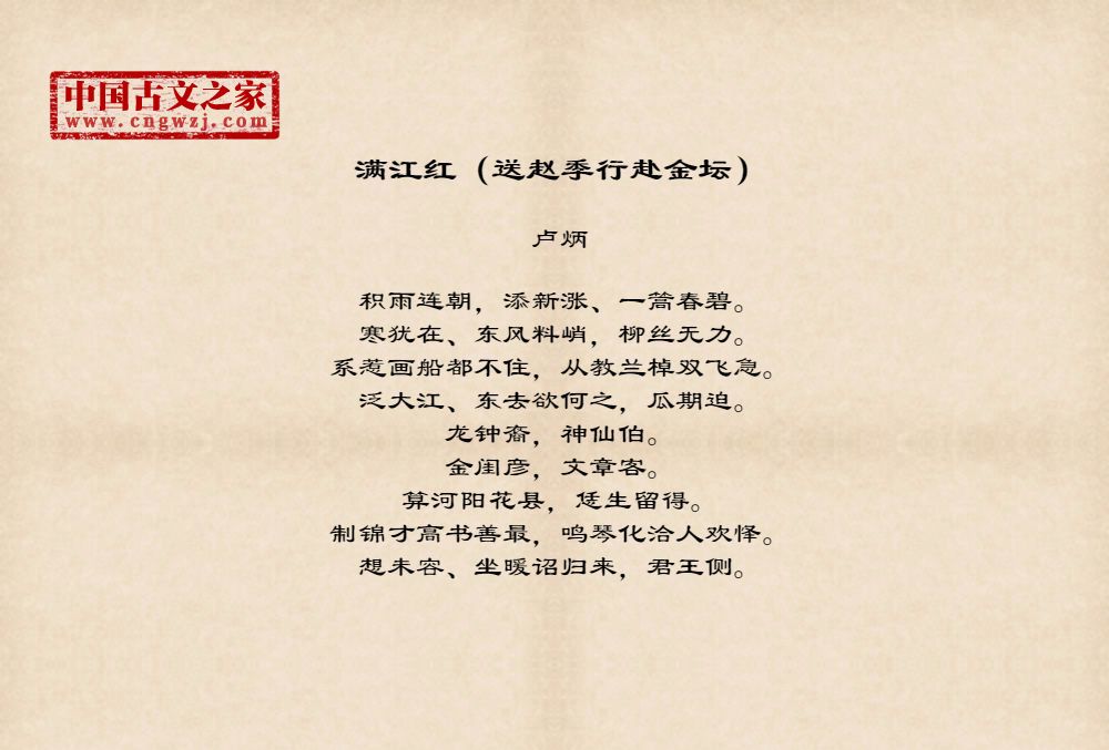 积雨连朝,添新涨、一篙春碧。寒犹在、东风料峭,柳丝无力。系惹画船都不住,从教兰棹双飞急。泛大江、东去欲何之,瓜期迫。龙钟裔,神仙伯。金闺彦,文章客。算河阳花县,恁生留得。制锦才高书善最,鸣琴化洽人欢怿。想未容、坐暖诏归来,君王侧。