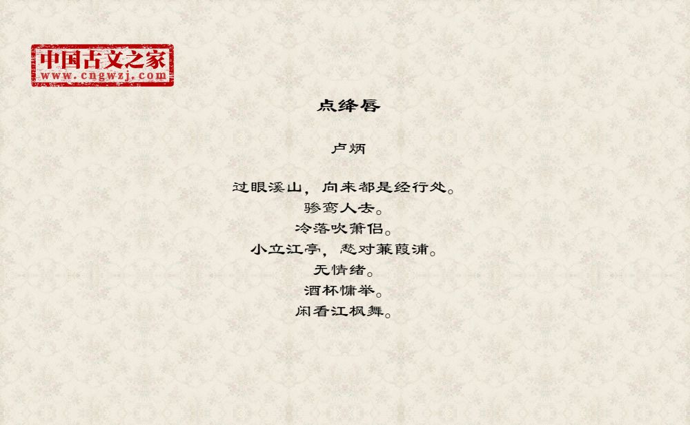 过眼溪山,向来都是经行处。骖鸾人去。冷落吹箫侣。小立江亭,愁对蒹葭浦。无情绪。酒杯慵举。闲看江枫舞。