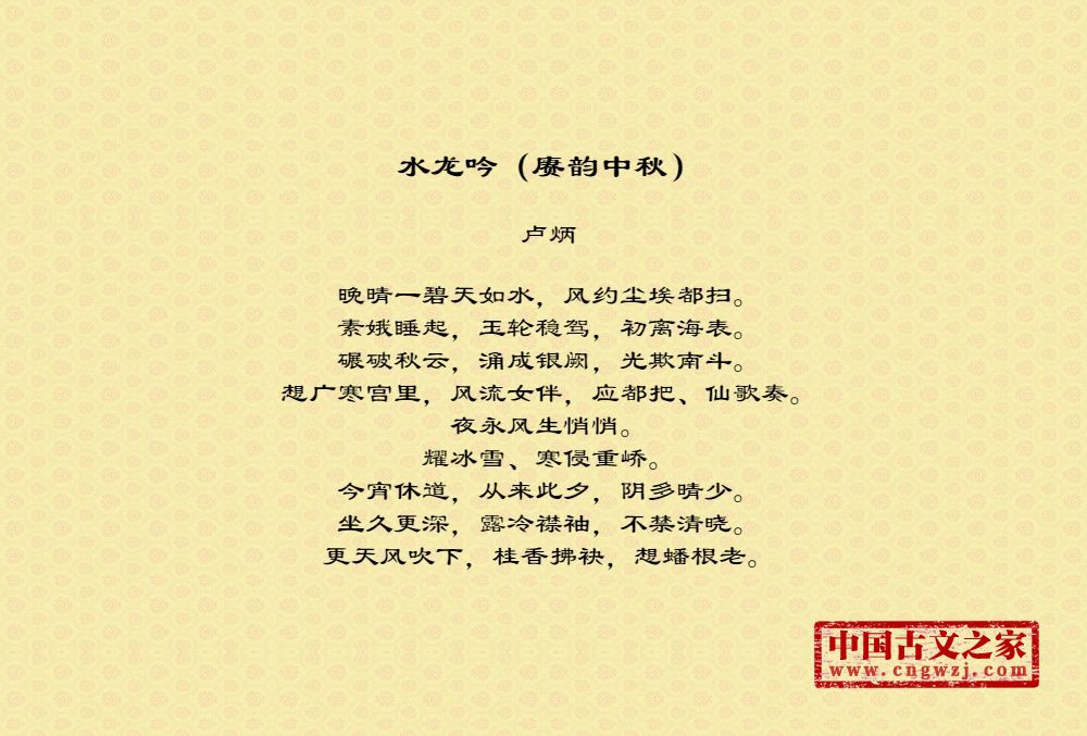 晚晴一碧天如水,风约尘埃都扫。素娥睡起,玉轮稳驾,初离海表。碾破秋云,涌成银阙,光欺南斗。想广寒宫里,风流女伴,应都把、仙歌奏。夜永风生悄悄。耀冰雪、寒侵重峤。今宵休道,从来此夕,阴多晴少。坐久更深,露冷襟袖,不禁清晓。更天风吹下,桂香拂袂,想蟠根老。