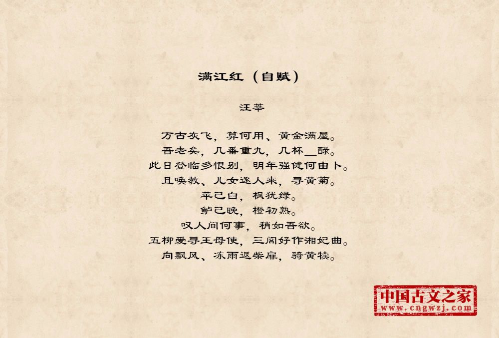 万古灰飞,算何用、黄金满屋。吾老矣,几番重九,几杯_醁。此日登临多恨别,明年强健何由卜。且唤教、儿女逐人来,寻黄菊。苹已白,枫犹绿。鲈已晚,橙初熟。叹人间何事,稍如吾欲。五柳爱寻王母使,三闾好作湘妃曲。向飘风、冻雨返柴扉,骑黄犊。