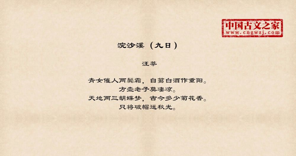 青女催人两鬓霜,自篘白酒作重阳。方壶老子莫凄凉。天地两三胡蝶梦,古今多少菊花香。只将破帽送秋光。