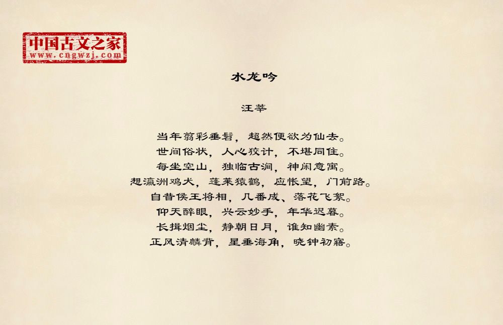 汪莘(1155~1227)南宋诗人。字叔耕,号柳塘,休宁(今属安徽)人,布衣。隐居黄山,研究《周易》,旁及释、老。宋宁宗嘉定年间,他曾三次上书朝廷,陈