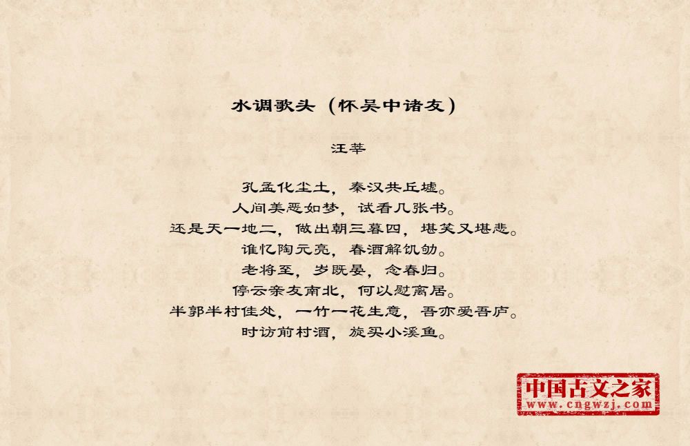 孔孟化尘土,秦汉共丘墟。人间美恶如梦,试看几张书。还是天一地二,做出朝三暮四,堪笑又堪悲。谁忆陶元亮,春酒解饥劬。老将至,岁既晏,念春归。停云亲友南北,何以慰离居。半郭半村佳处,一竹一花生意,吾亦爱吾庐。时访前村酒,旋买小溪鱼。