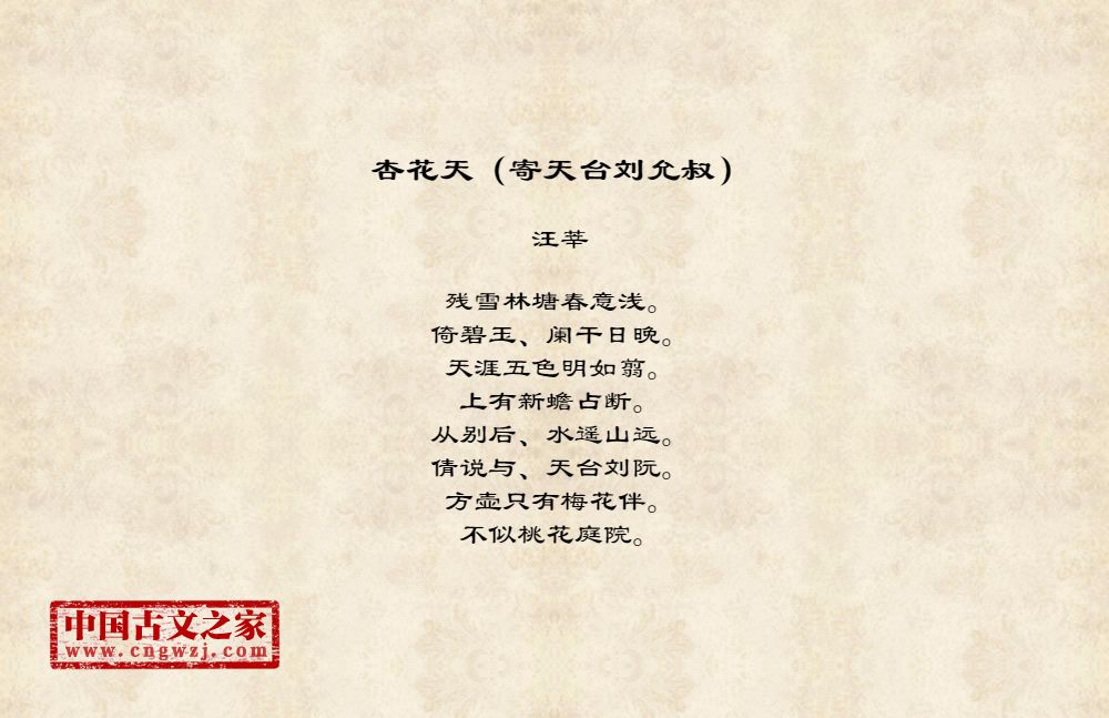 残雪林塘春意浅。倚碧玉、阑干日晚。天涯五色明如翦。上有新蟾占断。从别后、水遥山远。倩说与、天台刘阮。方壶只有梅花伴。不似桃花庭院。