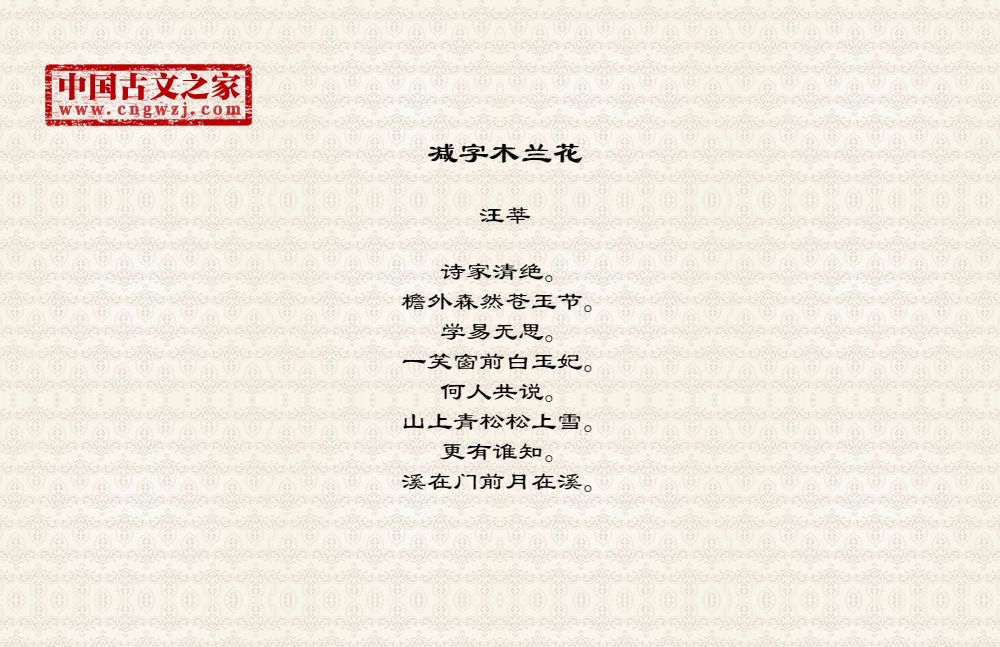 诗家清绝。檐外森然苍玉节。学易无思。一笑窗前白玉妃。何人共说。山上青松松上雪。更有谁知。溪在门前月在溪。