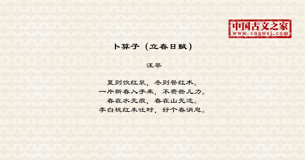 夏则饮红泉,冬则餐红术。一片新春入手来,不费些儿力。春在水无痕,春在山无迹。李白桃红未吐时,好个春消息。
