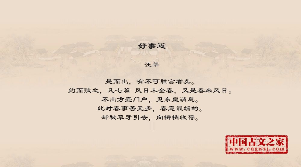 是而出,有不可胜言者矣。约而赋之,凡七篇 风日未全春,又是春来风日。不出方壶门户,见东皇消息。此时春事苦无多,春意最端的。却被草牙引去,向柳梢收得。||