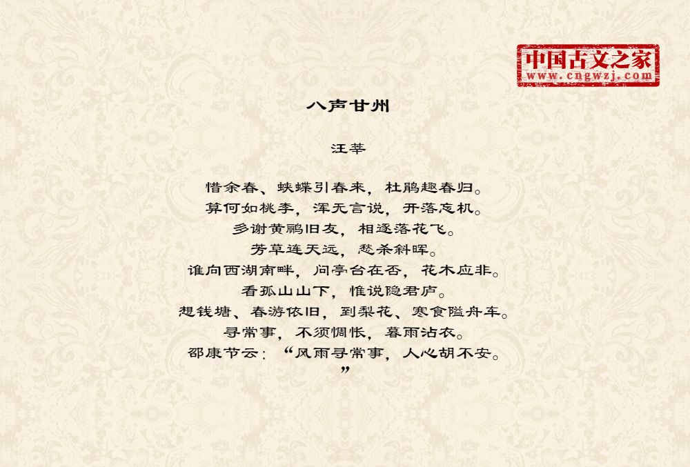 惜余春、蛱蝶引春来,杜鹃趣春归。算何如桃李,浑无言说,开落忘机。多谢黄鹂旧友,相逐落花飞。芳草连天远,愁杀斜晖。谁向西湖南畔,问亭台在否,花木应非。看孤山山下,惟说隐君庐。想钱塘、春游依旧,到梨花、寒食隘舟车。寻常事,不须惆怅,暮雨沾衣。邵康节云:“风雨寻常事,人心胡不安。”