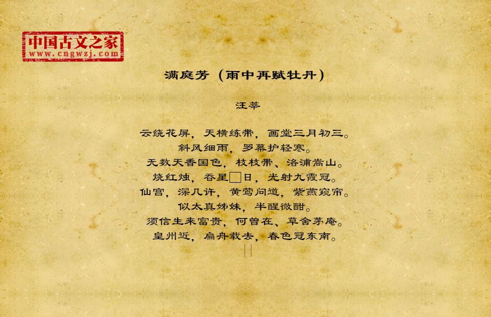 云绕花屏,天横练带,画堂三月初三。斜风细雨,罗幕护轻寒。无数天香国色,枝枝带、洛浦嵩山。烧红烛,吞星□日,光射九霞冠。仙宫,深几许,黄莺问道,紫燕窥帘。似太真姊妹,半醒微酣。须信生来富贵,何曾在、草舍茅庵。皇州近,扁舟载去,春色冠东南。||