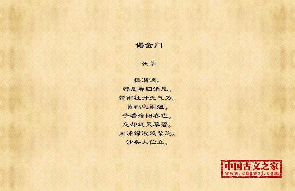 檐溜滴。都是春归消息。带雨牡丹无气力。黄鹂愁雨湿。争看洛阳春色。忘却连天草碧。南浦绿波双桨急。沙头人伫立。