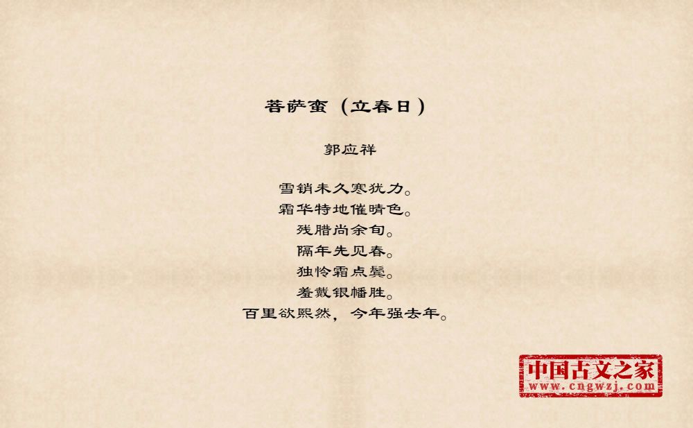 雪销未久寒犹力。霜华特地催晴色。残腊尚余旬。隔年先见春。独怜霜点鬓。羞戴银幡胜。百里欲熙然,今年强去年。