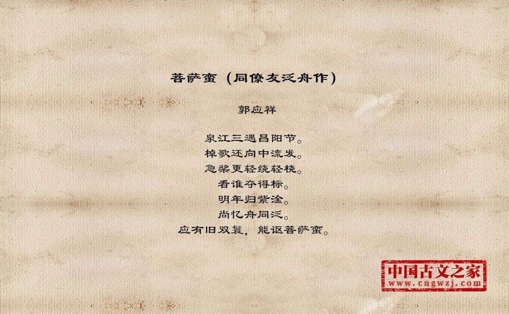 泉江三遇昌阳节。棹歌还向中流发。急桨更轻绕轻桡。看谁夺得标。明年归紫淦。尚忆舟同泛。应有旧双鬟,能讴菩萨蛮。