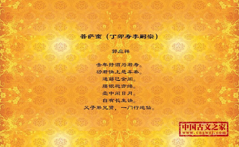 去年持酒为君寿。劝君快上悬车奏。通籍已金闺。腰银袍亦绯。壶中闲日月。自有长生诀。父子弟兄贤,一门行地仙。