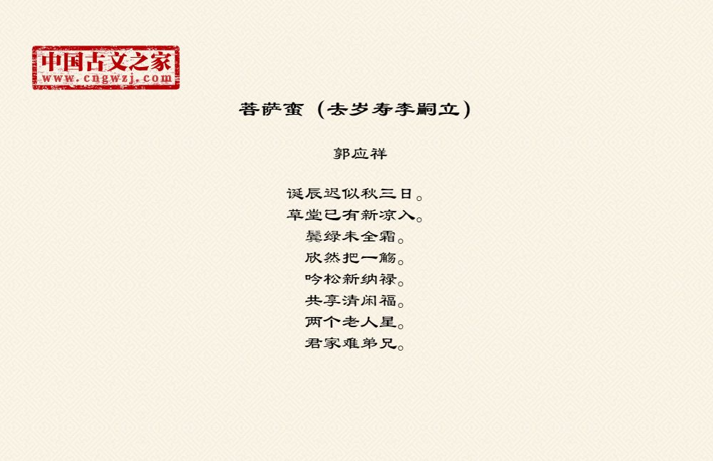 诞辰迟似秋三日。草堂已有新凉入。鬓绿未全霜。欣然把一觞。吟松新纳禄。共享清闲福。两个老人星。君家难弟兄。