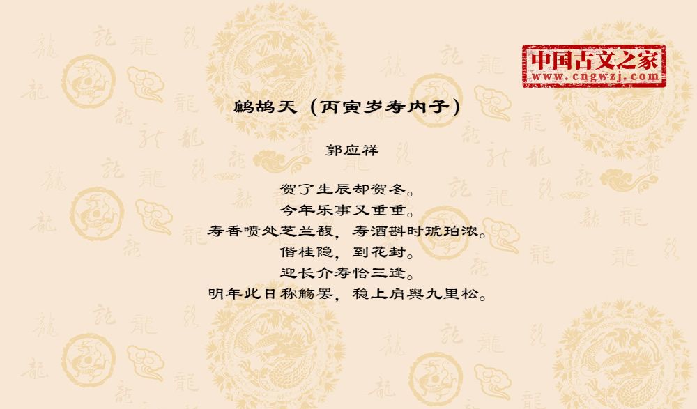 贺了生辰却贺冬。今年乐事又重重。寿香喷处芝兰馥,寿酒斟时琥珀浓。偕桂隐,到花封。迎长介寿恰三逢。明年此日称觞罢,稳上肩舆九里松。