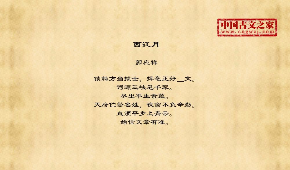 锁棘方当拔士,挥毫正好_文。词源三峡笔千军。尽出平生素蕴。天府伫登名姓,夜窗不负辛勤。直须平步上青云。始信文章有准。