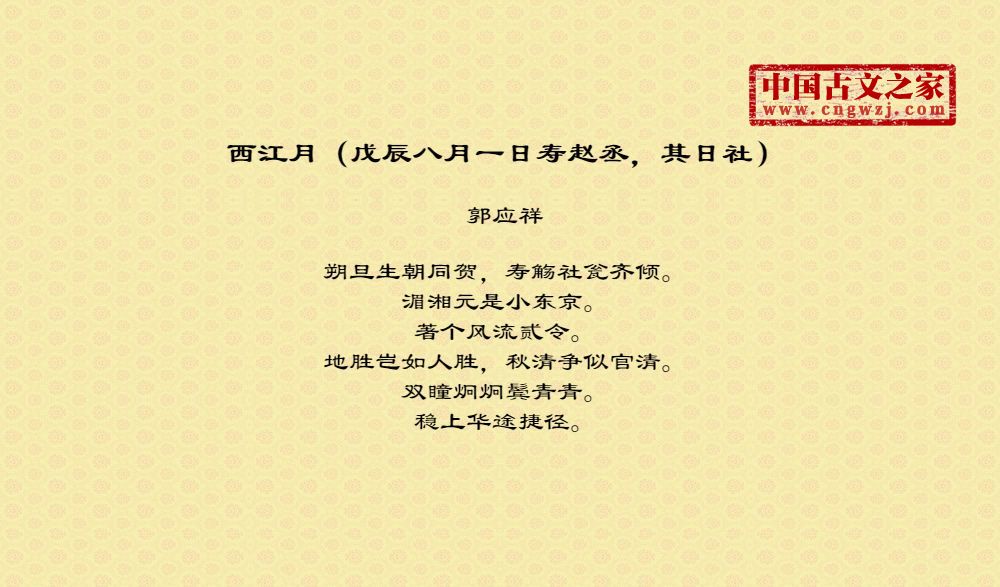 《西江月(戊辰八月一日寿赵丞,其日社)》由郭应祥创作