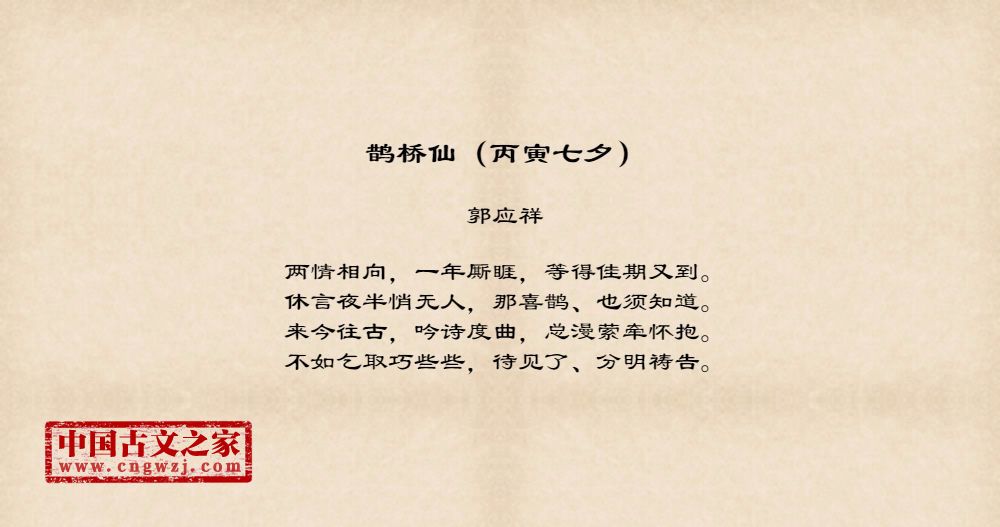 两情相向,一年厮睚,等得佳期又到。休言夜半悄无人,那喜鹊、也须知道。来今往古,吟诗度曲,总漫萦牵怀抱。不如乞取巧些些,待见了、分明祷告。