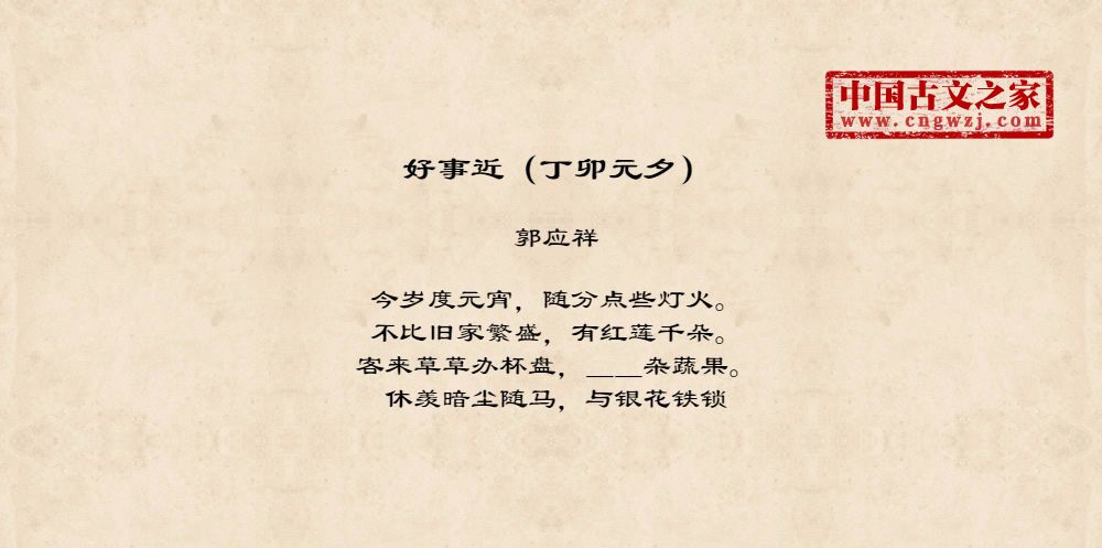 今岁度元宵,随分点些灯火。不比旧家繁盛,有红莲千朵。客来草草办杯盘,__杂蔬果。休羡暗尘随马,与银花铁锁