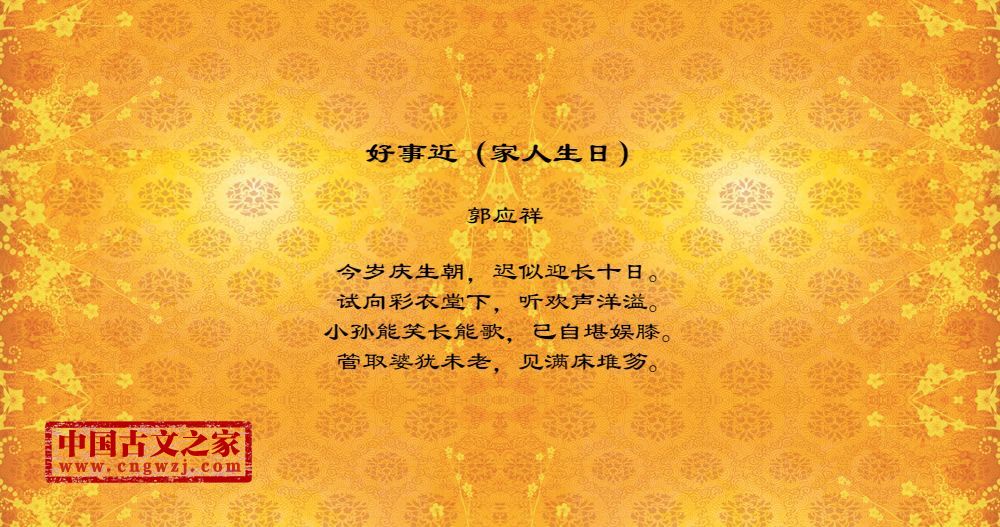 今岁庆生朝,迟似迎长十日。试向彩衣堂下,听欢声洋溢。小孙能笑长能歌,已自堪娱膝。管取婆犹未老,见满床堆笏。