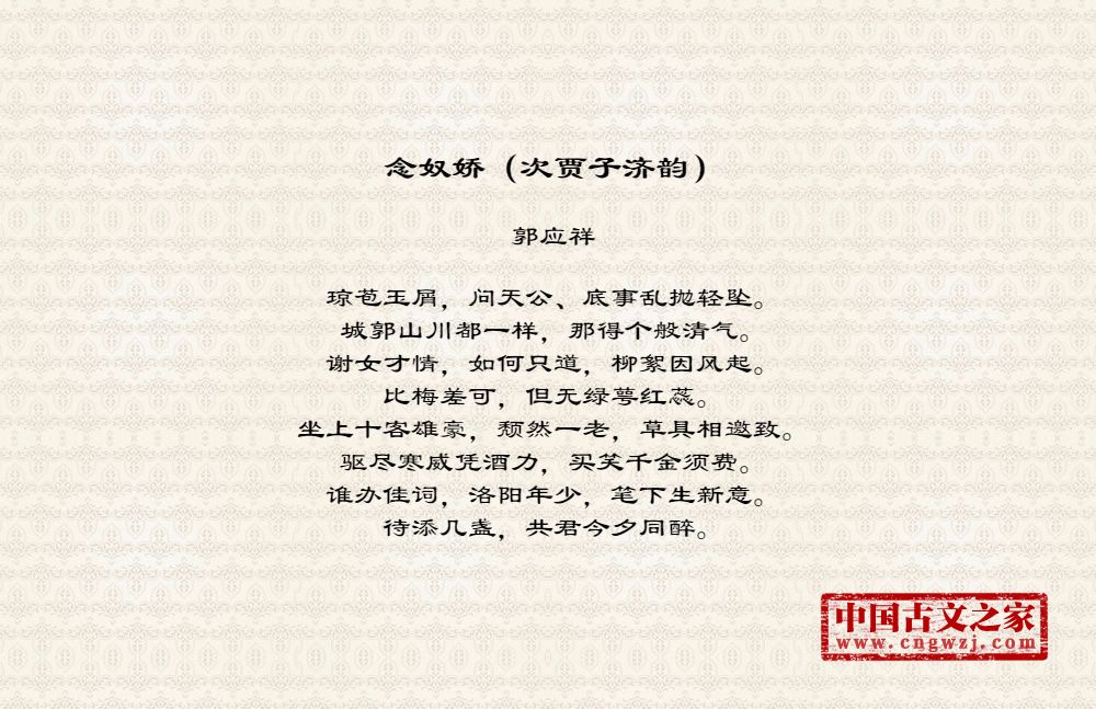 琼苞玉屑,问天公、底事乱抛轻坠。城郭山川都一样,那得个般清气。谢女才情,如何只道,柳絮因风起。比梅差可,但无绿萼红蕊。坐上十客雄豪,颓然一老,草具相邀致。驱尽寒威凭酒力,买笑千金须费。谁办佳词,洛阳年少,笔下生新意。待添几盏,共君今夕同醉。
