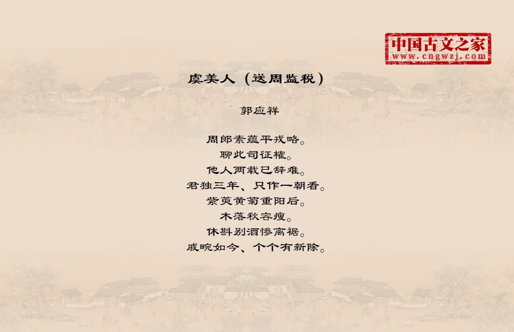 周郎素蕴平戎略。聊此司征榷。他人两载已辞难。君独三年、只作一朝看。紫萸黄菊重阳后。木落秋容瘦。休斟别酒惨离裾。戚畹如今、个个有新除。